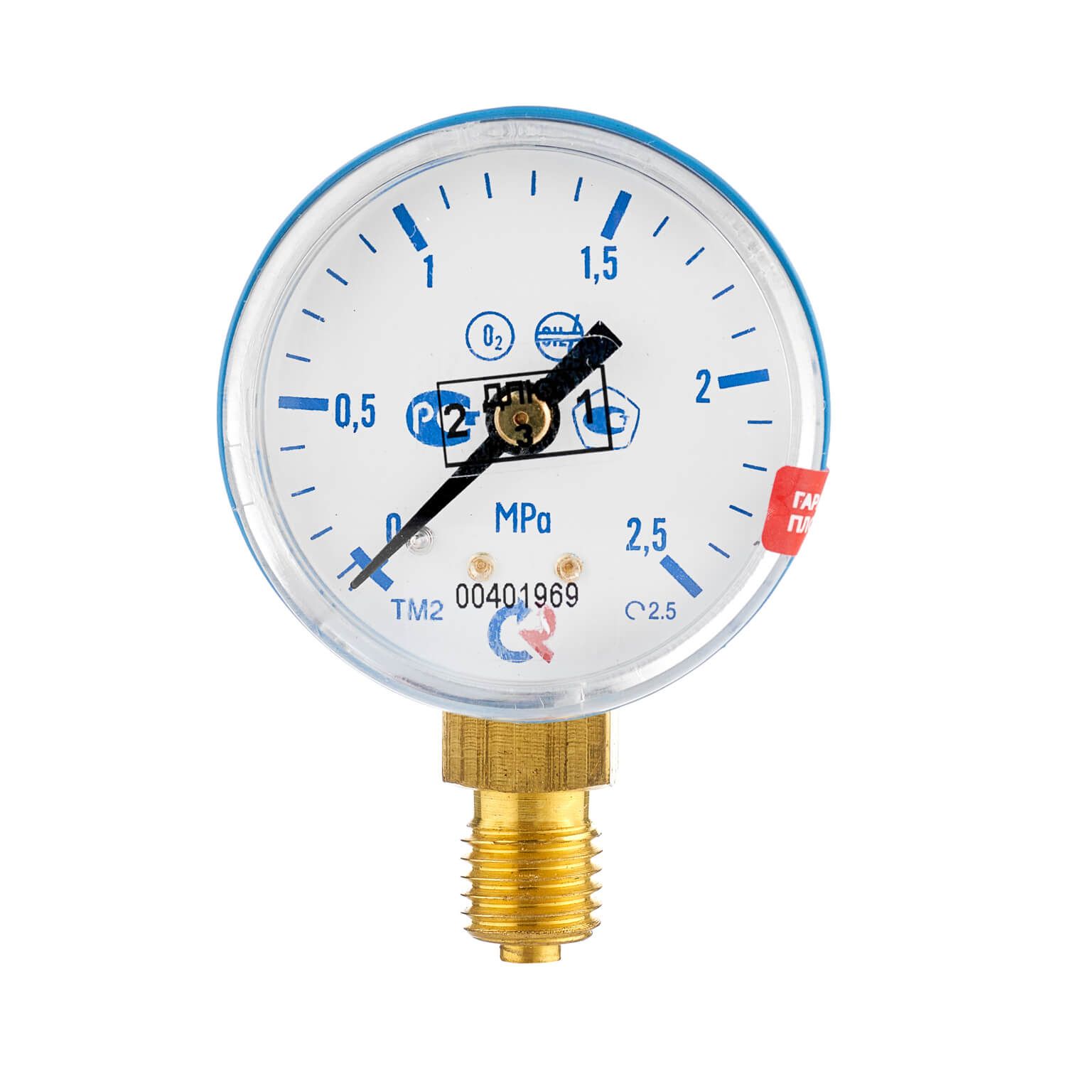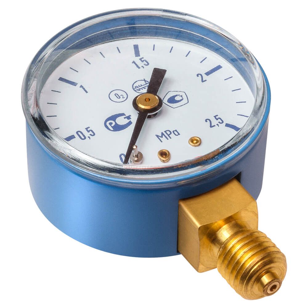 Сварочный манометр для кислорода (O2) производится с диаметром корпуса 50 мм. Класс точности: 2,5. Корпус манометра для редуктора выполнен из стали. Прибор имеет радиальное присоединение, резьба присоединения М12х1,5.