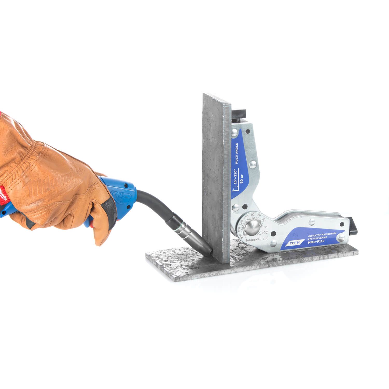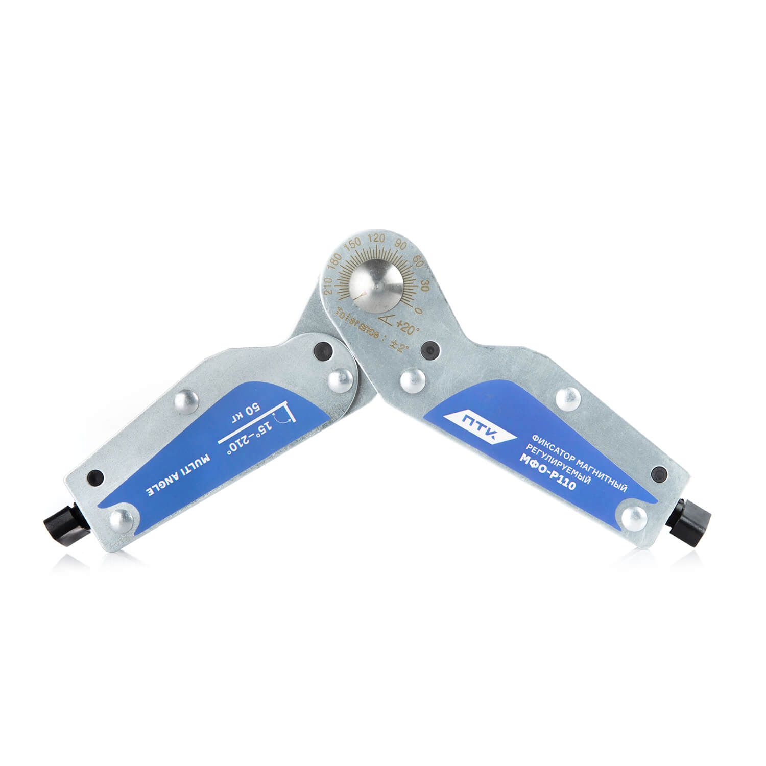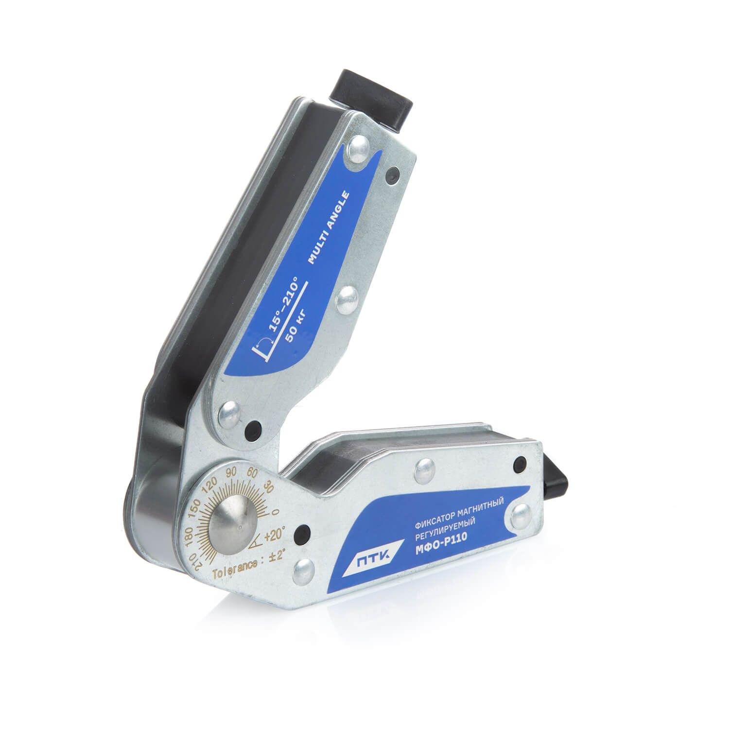 Магнитный фиксатор позволяет производить точное выставление углов в процессе сварки, пайки и монтаже конструкций с погрешностью 2°. МФО-Р110 позволяет регулировать угол от 15° до 210°.